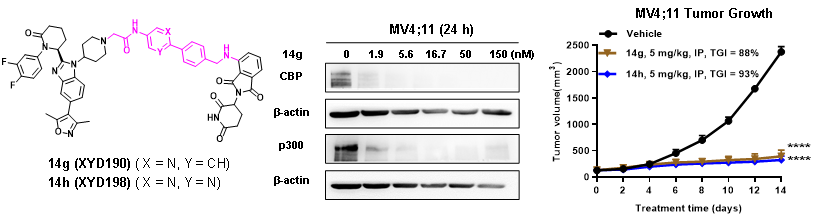 通過系統(tǒng)的構(gòu)效關(guān)系研究和生物活性評價,該團(tuán)隊發(fā)現(xiàn)了兩個高活性的具有雙芳香環(huán)Linker的CBP/p300降解劑XYD190和XYD198(圖2)。這兩個降解劑可有效抑制AML細(xì)胞系MV4;11的增殖(IC50分別為1.8 nM和0.9 nM),并以CRBN和蛋白酶體依賴的方式高效地降解CBP和p300蛋白(DC50?< 2?nM)(圖2)。蛋白質(zhì)組學(xué)研究表明,XYD190和XYD198可有效下調(diào)CBP/p300蛋白,并且對其它溴結(jié)構(gòu)域家族和分子膠底物的蛋白水平無明顯影響。在MV4;11異種抑制瘤模型中,XYD190和XYD198可顯著抑制腫瘤的生長(TGI分別為88%和93%)(圖2)。本研究為AML的治療提供了一種采用新的作用機(jī)制的更優(yōu)的候選藥物。