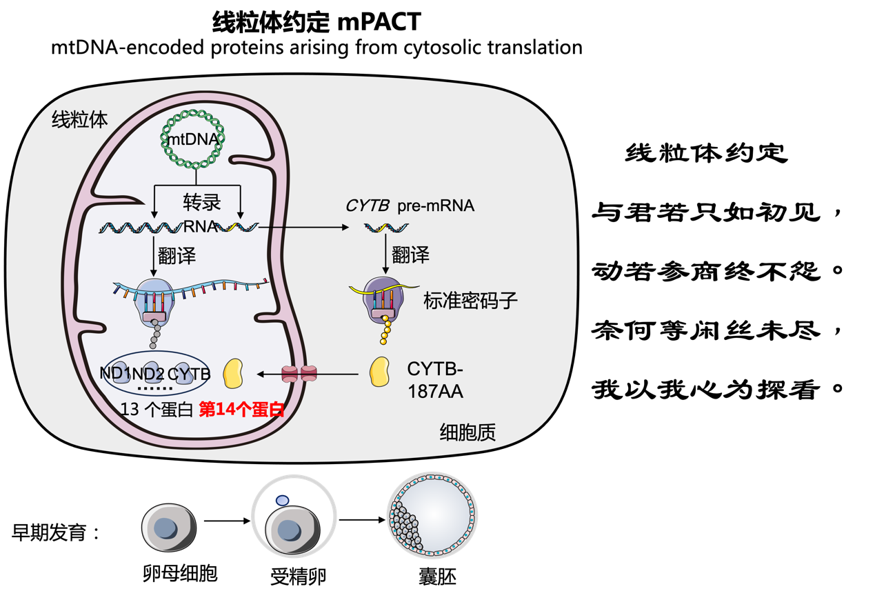 5月3日,中國科學院廣州生物醫(yī)藥與健康研究院劉興國課題組在Cell Metabolism期刊發(fā)表了題為“A novel protein CYTB-187AA encoded by the mitochondrial gene CYTB modulates mammalian early development”?的文章。該研究發(fā)現(xiàn)并證實,除13個的線粒體基因編碼的蛋白質(zhì)外,線粒體基因細胞色素 b (CYTB)可以產(chǎn)生一個線粒體基因編碼胞質(zhì)翻譯?(mtDNA-encoded proteins arising from cytosolic translation, mPACT) 的新蛋白CYTB-187AA,這一模式的英文縮寫PACT具有“約定”的含義,因此將這一新模式稱為“線粒體約定”。進一步揭示 CYTB-187AA在胞質(zhì)翻譯后定位到線粒體基質(zhì)中,通過ATP依賴的方式調(diào)控早期發(fā)育。