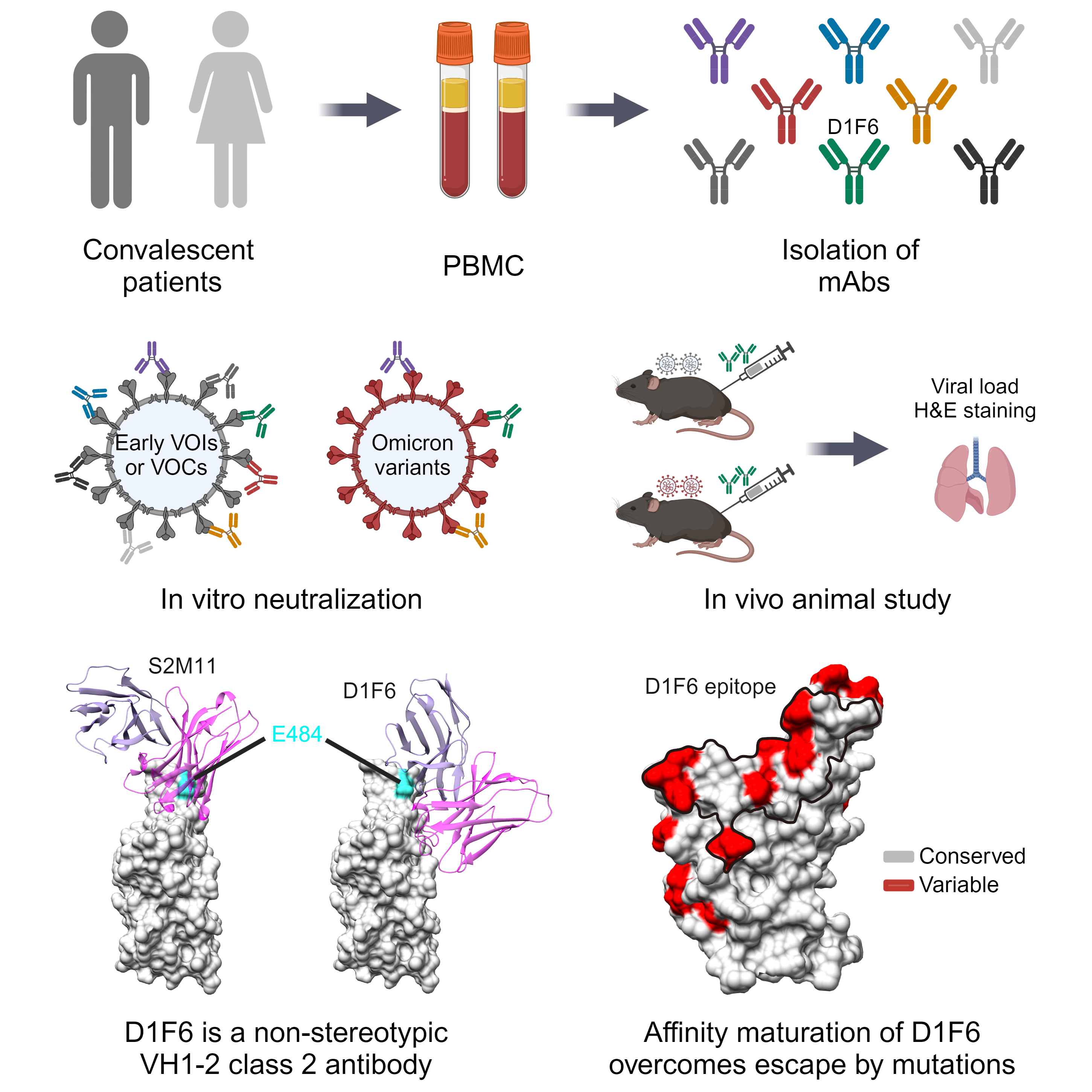 面對自然感染和疫苗接種產(chǎn)生的免疫壓力,新冠病毒持續(xù)進(jìn)化和變異,逃逸了絕大部分早期篩選獲得的中和抗體。其中,在人群中被廣泛誘導(dǎo)的VH1-2基因編碼抗體被認(rèn)為在新冠病毒早期的抗體免疫中起到了關(guān)鍵作用,但由于新冠病毒刺突蛋白E484K/A的突變,大多數(shù)VH1-2類抗體被逃逸。在該研究中,研究人員從早期新冠病毒野生株感染者中篩選到一株由VH1-2基因編碼的中和抗體D1F6。不同于其他已知的VH1-2抗體,D1F6不被攜帶E484A突變的Omicron變異株逃逸,對Omicron變異株的多種亞型仍保持高效中和活性。動物實(shí)驗(yàn)結(jié)果表明D1F6可以有效抑制Delta和Omicron?BA.5、XBB.1.5、EG.5.1等變異株在小鼠體內(nèi)的復(fù)制。