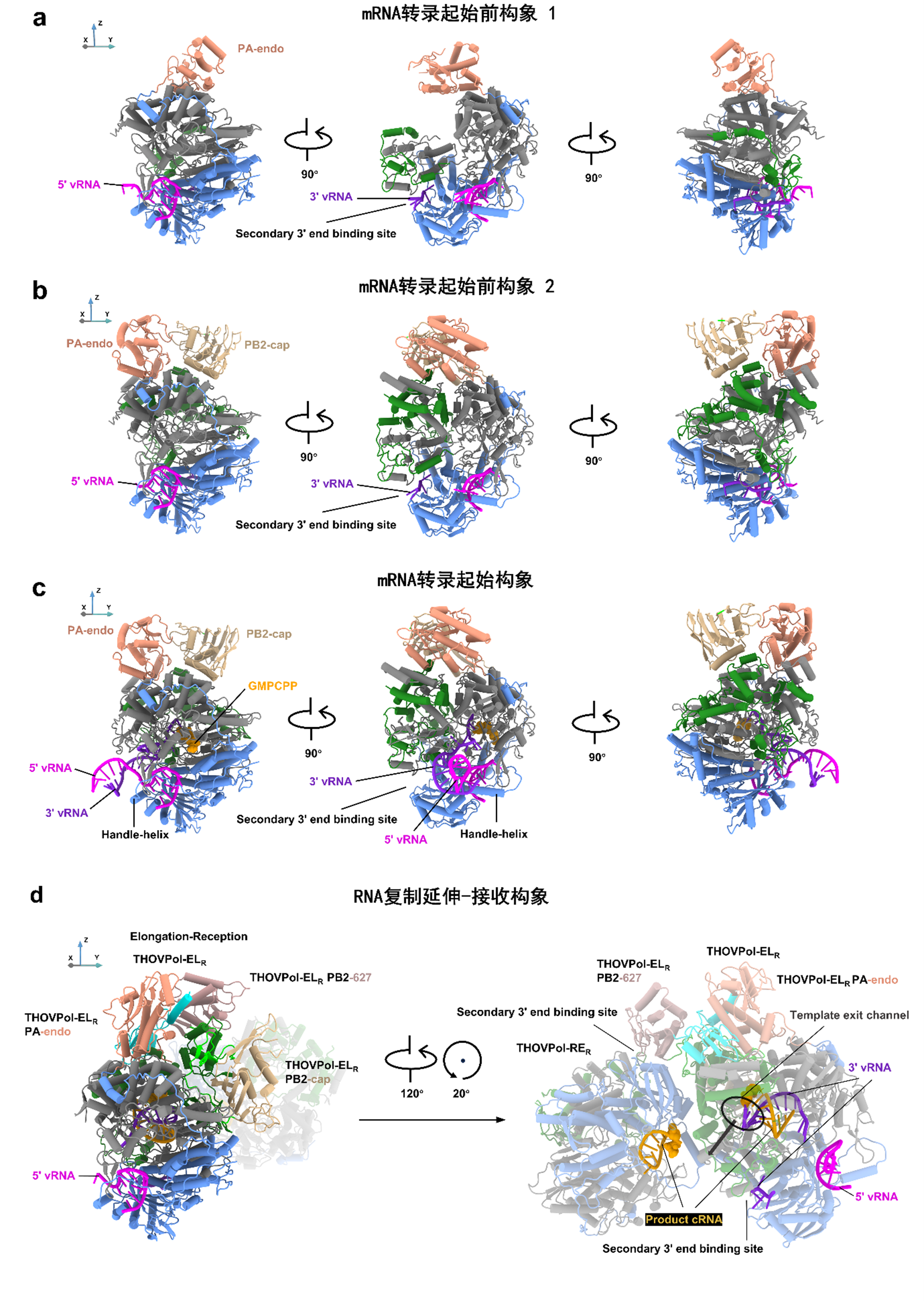 在該研究中,通過單顆粒冷凍電鏡技術,研究人員捕獲了THOV 聚合酶在RNA合成過程中的十個不同的構象。這些結構重現了THOV?RNA聚合酶在RNA轉錄和復制過程中的結構細節(jié)與多樣的構象變化。重要的是,這些結構顯示THOV聚合酶可以分別以有帽和無帽的二核苷酸引物啟動RNA轉錄和復制。結合THOV聚合酶的帽子結合和核酸內切酶結構域沒有活性的現象,研究發(fā)現提示,THOV聚合酶的帽子搶奪機制可能是非工作的,THOV可能利用細胞產生的有帽二核苷酸作為引物啟動mRNA的轉錄合成。這些發(fā)現與流感病毒聚合酶帽子搶奪機制依賴的mRNA轉錄機制形成了鮮明對比。