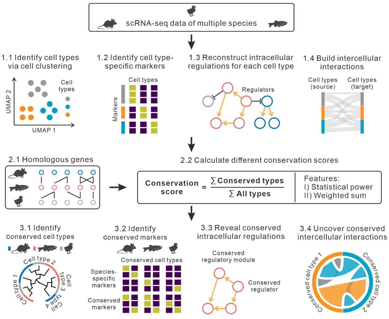 物種不僅在基因層面,也在細胞類型、基因表達、基因調控、細胞間相互作用等方面顯示出進化保守性。單細胞轉錄組測序技術已廣泛用于不同物種的單細胞表達研究,為在細胞類型水平研究物種的進化保守性提供了新機會。已有的算法能通過分析跨物種單細胞轉錄組數據識別進化保守的細胞類型,如Seurat和SAMap等。但是,這些方法主要通過跨物種的單細胞聚類確定保守細胞類型,其準確性在很大程度上取決于跨物種批次效應校正的能力。這些軟件對進化距離較遠物種進行聚類分析,仍存在明顯不足。此外,目前仍沒有方法能確定細胞間相互作用的進化保守性。