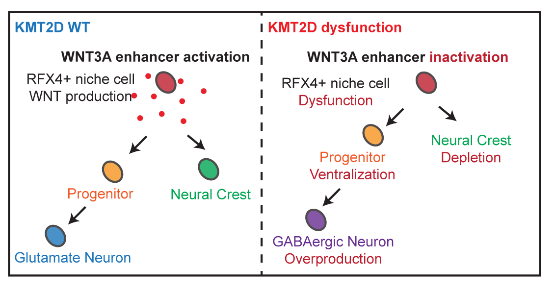 研究團(tuán)隊(duì)利用人胚胎干細(xì)胞以及KABUKI綜合征患者家系iPS細(xì)胞,建立含神經(jīng)嵴的類(lèi)腦器官分化模型。研究發(fā)現(xiàn)KMT2D失活后,Roof plate樣細(xì)胞無(wú)法正常激活WNT3A的核心增強(qiáng)子,微環(huán)境WNT信號(hào)活性不足,從而導(dǎo)致神經(jīng)干細(xì)胞提前分化且異常傾向抑制性神經(jīng)元譜系方向,同時(shí)導(dǎo)致神經(jīng)嵴譜系分化障礙;進(jìn)一步通過(guò)WNT3A增強(qiáng)子敲除的人胚胎干細(xì)胞模型和?Kmt2d?突變小鼠模型驗(yàn)證了這一結(jié)論,同時(shí)在KMT2D-KO類(lèi)腦器官的分化培養(yǎng)中添加WNT信號(hào)通路激動(dòng)劑或WNT3A蛋白,成功在類(lèi)器官水平上挽救了該疾病表型。
