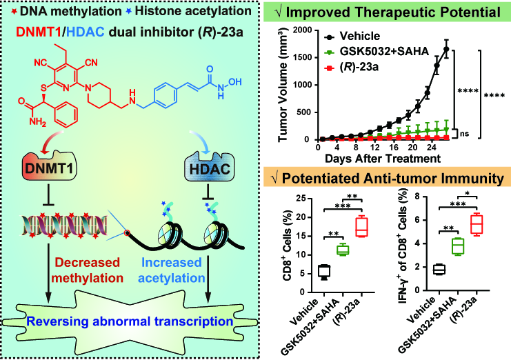在該研究中,團隊通過融合DNMT1和HDAC抑制劑的關(guān)鍵藥效基團,獲得了一系列DNMT1/HDAC雙效抑制劑。其中,化合物(R)-23a在體外和細胞中對DNMT1和Class-I HDAC表現(xiàn)出有效的“在靶”抑制活性,從而逆轉(zhuǎn)腫瘤特異性DNA高甲基化和組蛋白低乙酰化。與DNMT1或HDAC單靶點抑制劑相比,化合物(R)-23a引起更為顯著的轉(zhuǎn)錄組變化,包括激活多個表觀遺傳沉默的抑癌基因和下調(diào)關(guān)鍵致癌基因。在抗腫瘤活性和安全性方面,DNMT1/HDAC雙效抑制劑(R)-23a可通過直接殺傷腫瘤細胞,或重編程腫瘤免疫微環(huán)境,進而誘導(dǎo)實體腫瘤的消退,其抗腫瘤活性和安全性優(yōu)于單一靶點藥物聯(lián)用。
