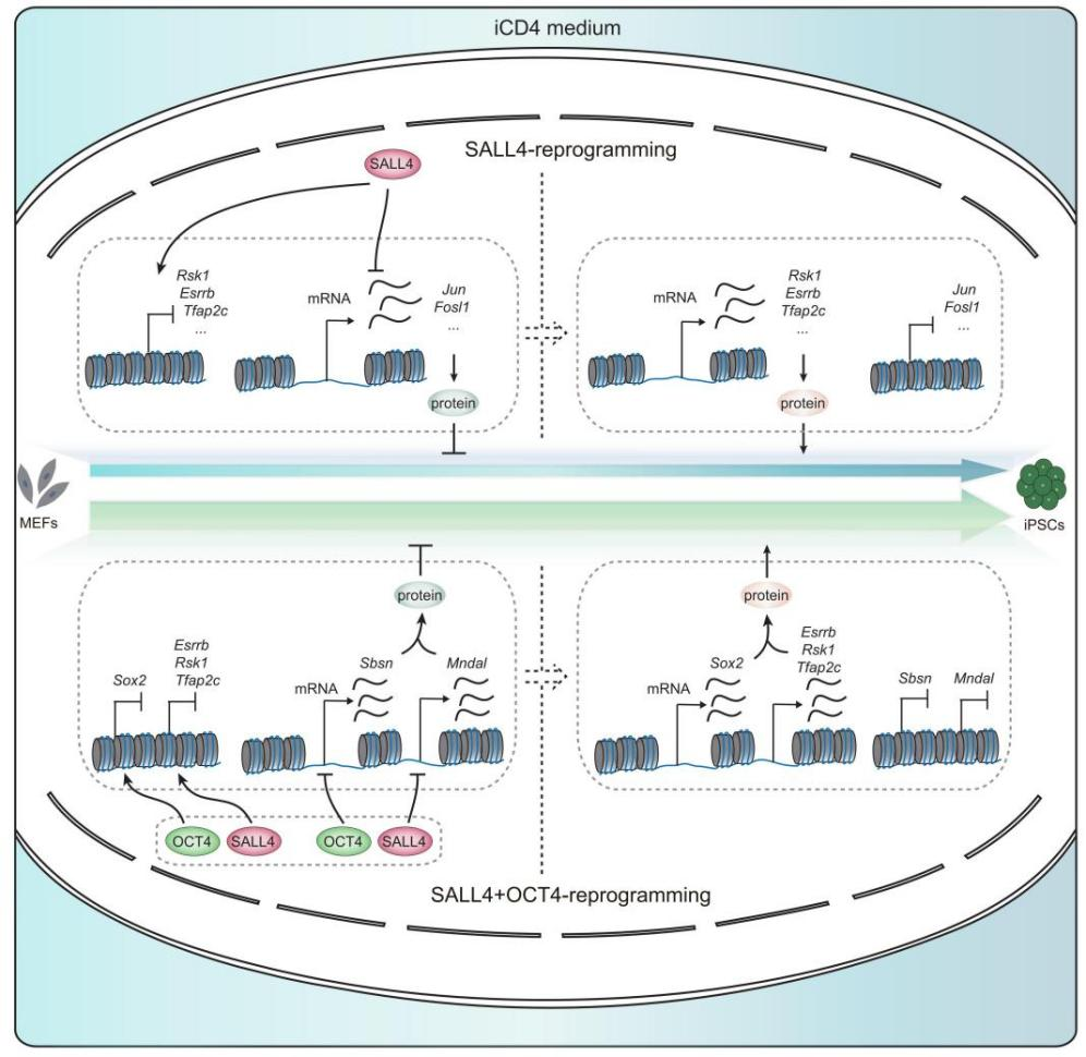 SALL4單因子誘導(dǎo)體細(xì)胞重編程及SALL4與OCT4協(xié)同促進(jìn)重編程機(jī)制模式圖