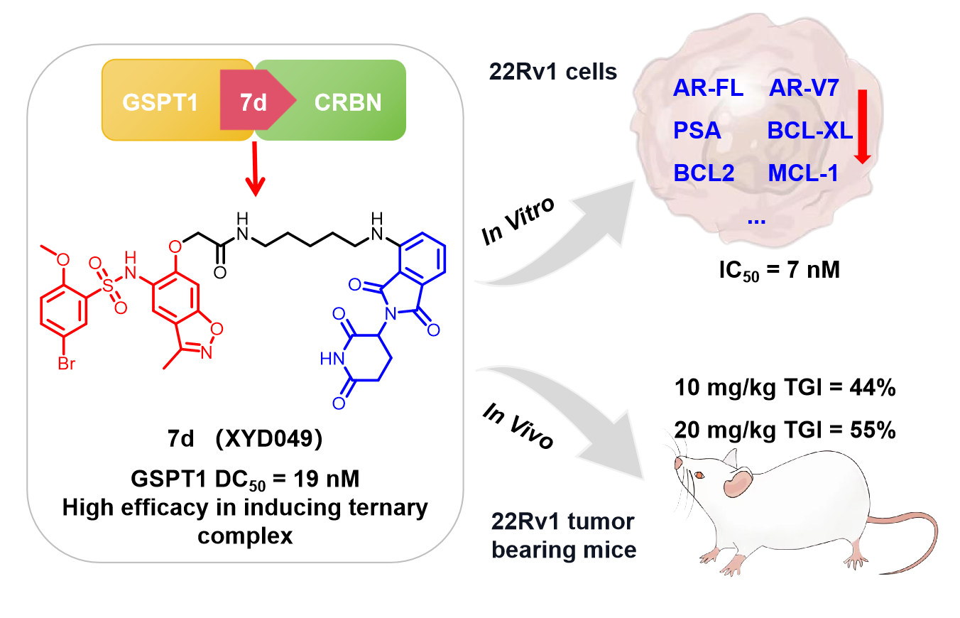 近日,中國(guó)科學(xué)院廣州生物醫(yī)藥與健康研究院的許永團(tuán)隊(duì)在治療去勢(shì)抵抗性前列腺癌(CRPC)的研究中取得了重要進(jìn)展。他們報(bào)道了一種在CRPC治療中具有顯著療效的GSPT1選擇性分子膠降解劑XYD049(7d),為開發(fā)新的CRPC治療策略提供了有力支持。相關(guān)成果已在藥物化學(xué)領(lǐng)域Top期刊Journal of Medicinal Chemistry上發(fā)表。