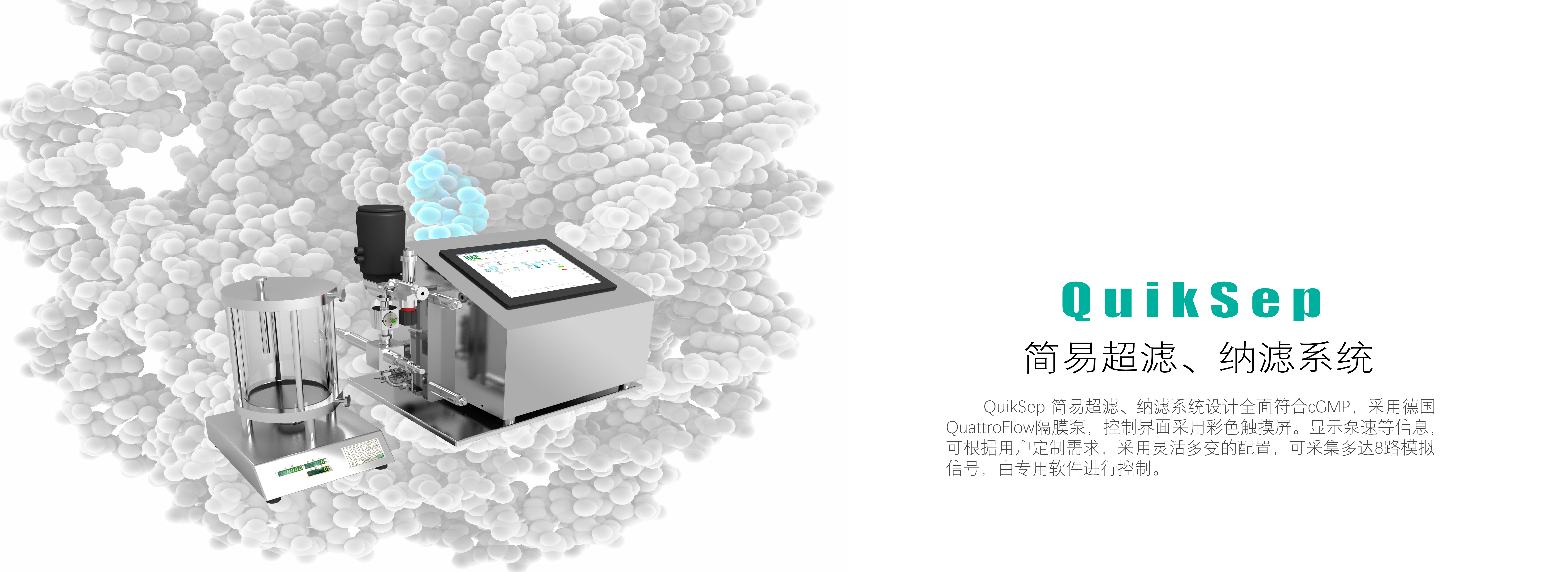 QuikSep SF簡易超濾系統(tǒng)設(shè)計(jì)全面符合cGMP,采用德國QuattroFlow隔膜泵,控制界面采用彩色觸摸屏,顯示泵速等信息,能實(shí)時(shí)監(jiān)測壓力及TMP變化,透過端紫外變化,并可設(shè)置各參數(shù)報(bào)警值,也可實(shí)現(xiàn)恒壓運(yùn)行或恒定TMP運(yùn)行,保證工藝可控性