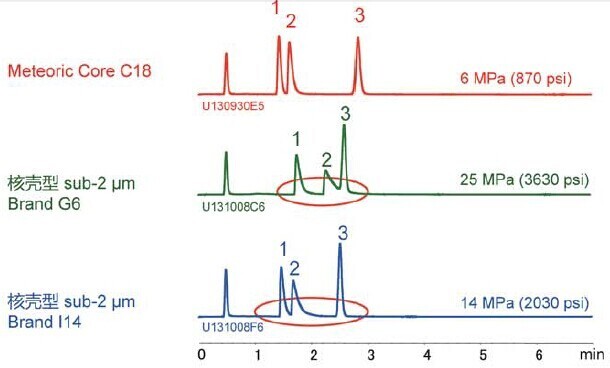 Meteoric Core C18與常規(guī)使用的全多孔型C18相比,在相同條件下可使分析時(shí)間縮短至2/3。因其具有卓越的分離能力,即使將流速提高1倍,仍可維持高效的理論塔板數(shù)狀態(tài)并使分析時(shí)間縮短至1/3,而此時(shí)色譜柱背壓不足5000psi,與普通Sub-2um色譜柱相比,色譜柱背壓更低的Meteoric Core C18為HPLC和UHPLC的使用分析中提供了高性能高生產(chǎn)性的新選擇。