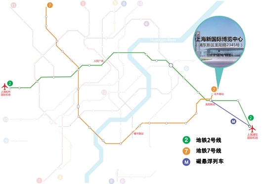 上海新國際博覽中心戰(zhàn)略性地坐落于浦東經(jīng)濟(jì)開發(fā)區(qū),距離上海新國際博覽中心600米處有一大型交通樞紐站,即龍陽路站(位于龍陽路上),包括多條路公交線路起點(diǎn)站、軌道交通2號線龍陽路站、軌道交通7號線龍陽路站以及磁懸浮列車終點(diǎn)站。從2號線龍陽路站步行到展館大約需10分鐘;從7號線花木路站步行到展館大約1分鐘。