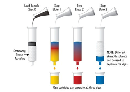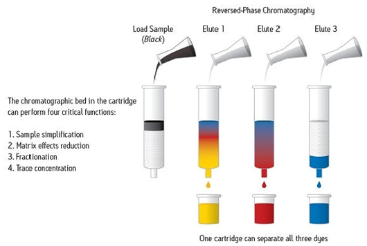 SPE通常是一種使用裝在柱芯型裝置內(nèi)的固體顆粒和色譜填充材料對(duì)樣品中的不同組分進(jìn)行化學(xué)分離的樣品制備技術(shù)。樣品幾乎始終呈液態(tài),但特殊應(yīng)用項(xiàng)目可能使用氣相中的某些樣品進(jìn)行。圖1顯示出一份樣品(圖示為黑色)正在使用SPE裝置進(jìn)行處理,以使組成該樣品的每種染色組分通過(guò)色譜分析實(shí)現(xiàn)分離。