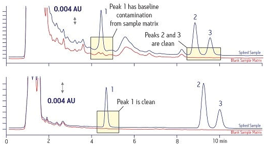 圖5給出了另一個(gè)示例??可系淖V圖表明化合物#1和#2均受到樣品基質(zhì)引起的明顯干擾??肯碌淖V圖表明使用SPE進(jìn)行適當(dāng)樣品制備后可顯著提高結(jié)果質(zhì)量(基線干凈)。請(qǐng)注意,一條明顯更干凈的基線可提高分析結(jié)果的準(zhǔn)確度。如果該樣品需要對(duì)化合物進(jìn)行分離和純化,那么也可以獲得一種純度明顯更高的萃取物。