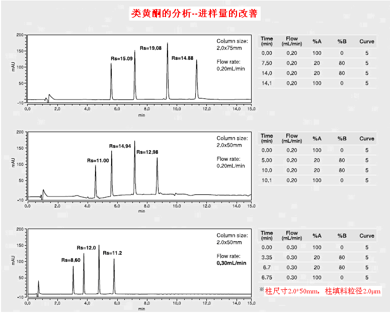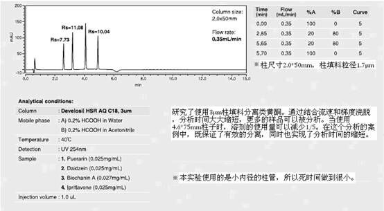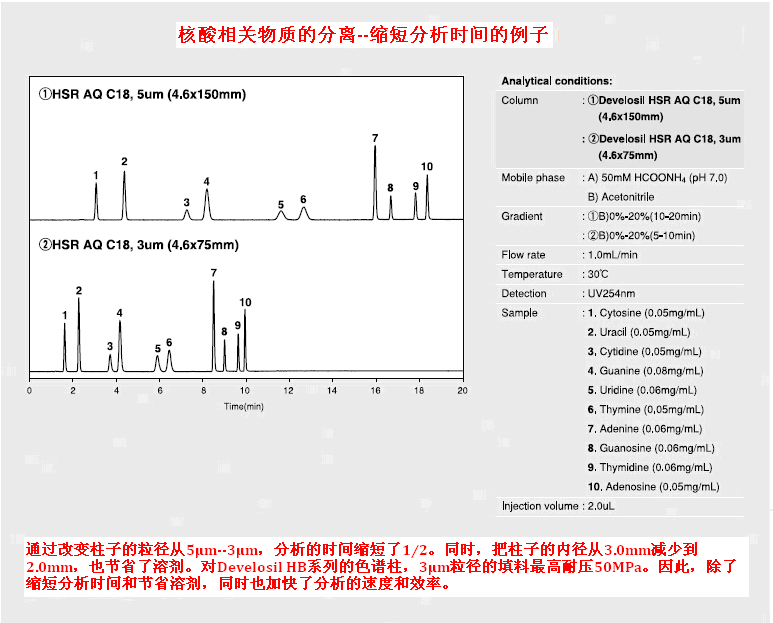縮短分析時(shí)間可以幫助分析者提高工作效率。Develosil系列色譜柱會(huì)嚴(yán)格的控制填料的粒徑,所以通過縮小柱填料的粒徑,可以精準(zhǔn)的縮短分析時(shí)間。
