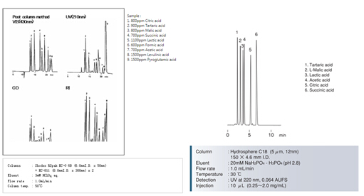 同時,SHODEX公司的KC-811柱和YMC公司的Hydrosphere C18柱,也能同時分離多種有機酸。