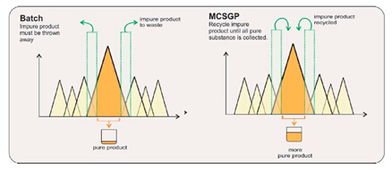 Contichrom層析系統(tǒng)所特有的MCSGP功能(Multicolumn Countercurrent Solvent Gradient Purification),可將目標(biāo)產(chǎn)物與雜質(zhì)的重疊部分回收,進(jìn)行循環(huán)式的層析操作,從而最大限度地提純產(chǎn)品,使得純度和收率二者兼得。運(yùn)行MCSGP功能時,各cycle僅將最純組分收作目標(biāo)產(chǎn)物,從而保證了高純度;各cycle均將重疊部分進(jìn)行回收再上樣,從而保證了高收率。