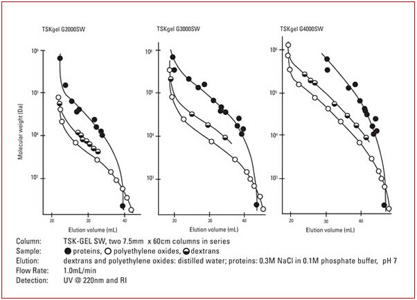 SW型柱以高多孔性硅膠顆粒為基礎(chǔ),其表面因受二醇功能基配體的衍生作用保護(hù)而不與蛋白質(zhì)相互作用。TSKgel SW型柱憑借其大孔隙容積而勝過(guò)其它硅膠基質(zhì)或聚合物高性能尺寸排阻柱。