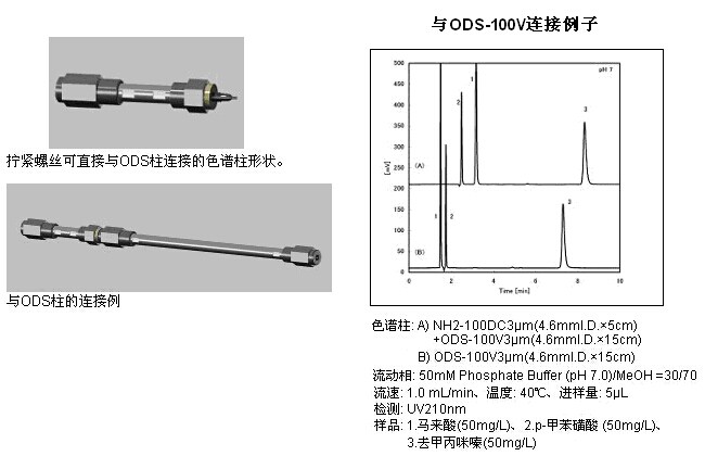 TSKgel NH2-100 DC 3μm 以鍵合了氨烷基的硅膠填料裝填了與后段的分析柱可以直接連接的色譜柱。不使用連接管也可連接2根色譜柱,可減少導(dǎo)致分離性能降低的死體積,2根分離模式不同的色譜柱的一體化,使用起來更方便。鍵合的氨基作為陰離子交換基發(fā)揮作用,協(xié)助完成后段色譜柱的分離,從而實(shí)現(xiàn)更好的分離成為可能。特別是與反相色譜柱的連接,醫(yī)藥品中的藥效成分和共存陰離子的同時(shí)分析成為可能。