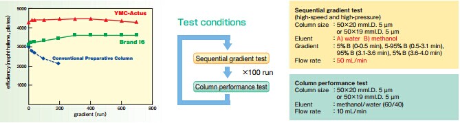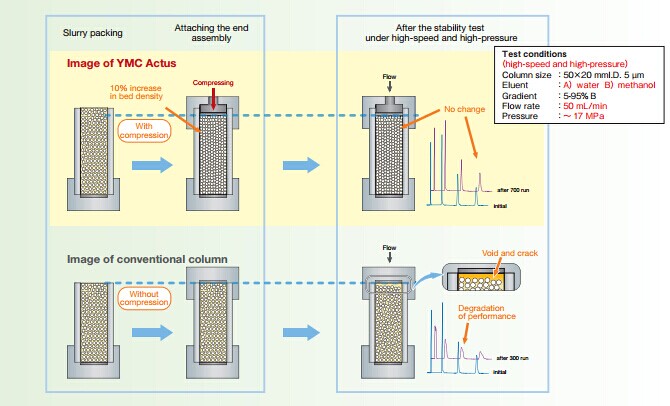 1. 應(yīng)用動(dòng)態(tài)軸向壓縮柱技術(shù)的制備用填充柱,在柱端裝備時(shí)進(jìn)行適度加壓。因此,裝填密度比過去的產(chǎn)品約上升10%。