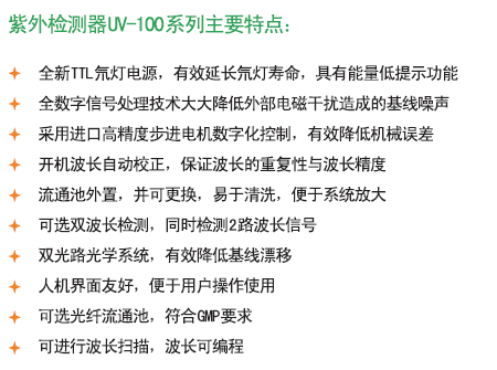 檢測(cè)器指能檢測(cè)色譜柱流出組分及其量的變化的器件。對(duì)檢測(cè)器的要求是:靈敏度高,線性范圍寬,重現(xiàn)性好,穩(wěn)定性好,響應(yīng)速度快,對(duì)不同物質(zhì)的響應(yīng)有規(guī)律性及可預(yù)測(cè)性。QuikSep UV全波長(zhǎng)檢測(cè)器可設(shè)置2個(gè)波長(zhǎng)同時(shí)檢測(cè)!