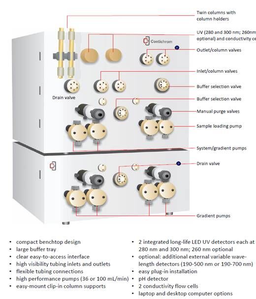 Contichrom層析系統(tǒng),已由2004年的6-8柱位設(shè)計、2006年的3柱位設(shè)計,發(fā)展為最優(yōu)化的2柱位設(shè)計,可運行多種層析模式,如標準批處理過程、MCSGP(多柱逆流溶劑梯度純化)、N-Rich等,實現(xiàn)了層析新技術(shù)與層析系統(tǒng)軟硬件設(shè)計的完美結(jié)合,使得設(shè)備成本更低,構(gòu)造更為簡化,并可使層析填料、緩沖液等成本投入大為節(jié)省,同時也使得純化周期大為縮短。