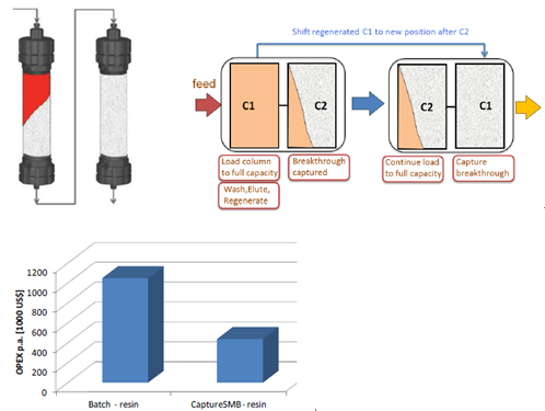 傳統(tǒng)層析工藝,由于流穿效應,有30-50%的填料是無法被完全利用的,從而使得載量和處理量大為受限。Capture SMB用于優(yōu)化捕獲環(huán)節(jié),作為最簡單和最強大的2柱位設(shè)計,可使純化效率顯著提高,并且使填料用量大為縮減。
