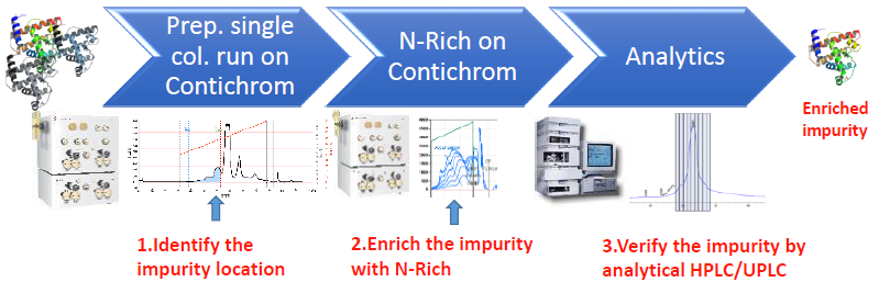 N-Rich工藝是微量物質(zhì)的富集過程,比如將產(chǎn)品的相關(guān)雜質(zhì)選擇性地富集在一個循環(huán)的層析過程中,待富集至目標量,再進行洗脫回收。該方法特別適用于分離與產(chǎn)品有關(guān)的雜質(zhì),如異構(gòu)體和聚集體,并同時用于發(fā)現(xiàn)研究。