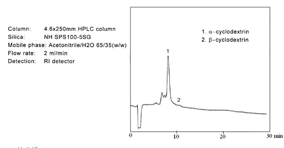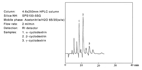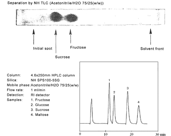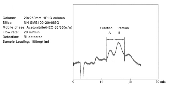 ? ? ? 糖類物質(zhì)的分析和制備,在液相色譜領(lǐng)域占有重要的地位。迄今為止,大多數(shù)的分離介質(zhì)僅僅局限在分析級別。但是富士硅膠研發(fā)出用于制備色譜的新的氨基硅膠。當(dāng)使用高水相為流動相時,一般的氨基填料會暴露出很多問題。氨基硅膠的pH值很高,一般pH為9.0,在這樣高的pH條件下,目標(biāo)化合物一般都會變性,并且會毀壞硅膠基質(zhì)的表面??紤]到這些問題,富士公司研發(fā)出新的氨基硅膠填料,稱之為NH SG硅膠。NH SG硅膠可以最小化甚至是避免上述問題,并且對糖類化合物進(jìn)行更好的分離。