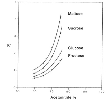 糖類的分離通常用到的是乙腈/水做流動相。當(dāng)乙腈的含量增加,保留因子k’增加。但是乙腈的含量需要仔細(xì)的控制,因?yàn)殡S著乙腈含量的增加,樣品的溶解性會變差。