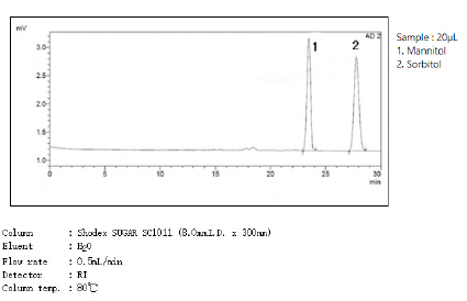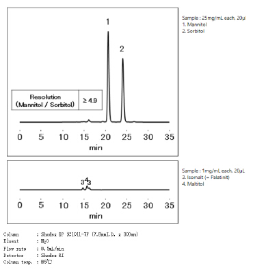 歐洲藥典EP和日本藥典JP規(guī)定,分析甘露醇使用Ca型強陽離子交換柱,色譜柱尺寸7.8*300mm,甘露醇與山梨醇的分離度達(dá)到2以上。同樣對應(yīng)Shodex SUGAR SC1011-7F,能夠符合歐洲藥典/日本藥典的要求。