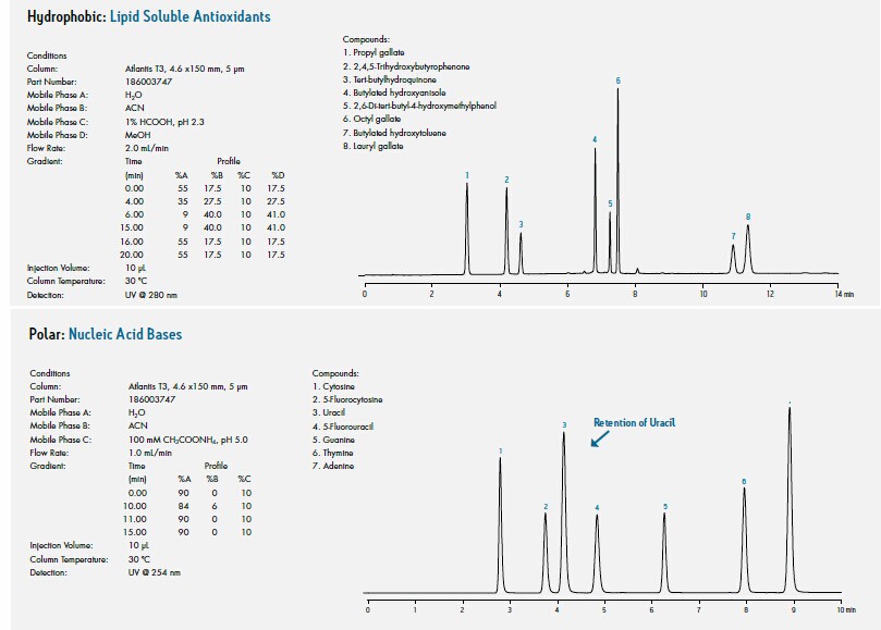 在對于極性化合物的反相HPLC保留與分離方面,Atlantis T3為極性化合物保留設(shè)立了行業(yè)標(biāo)準(zhǔn)。Atlantis T3色譜柱是通用的、硅膠反相C18柱,它不僅能保留和分離水溶性的極性小分子有機(jī)化合物,而且還為這項(xiàng)優(yōu)異能力提供了更寬的pH操作范圍。對于反相應(yīng)用,要開發(fā)極性(和非極性)化合物的保留分離方法時,Atlantis T3應(yīng)該作為第一選擇。